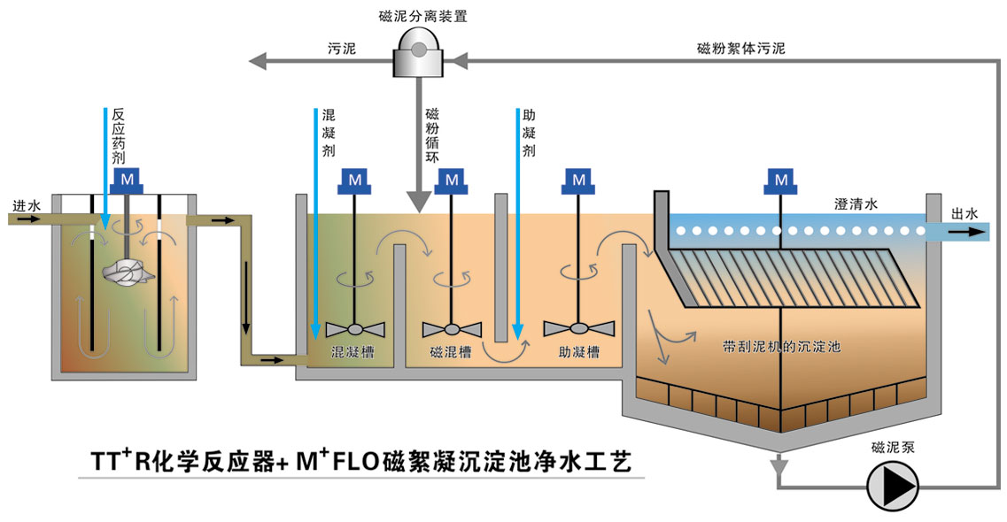 ·M+FLO磁絮凝沉淀池凈水系統 ·TT+R高效反應器+M+FLO磁絮凝沉淀池凈水系統 ·ECR電化學反應器+M+FLO磁絮凝沉淀池凈水系統